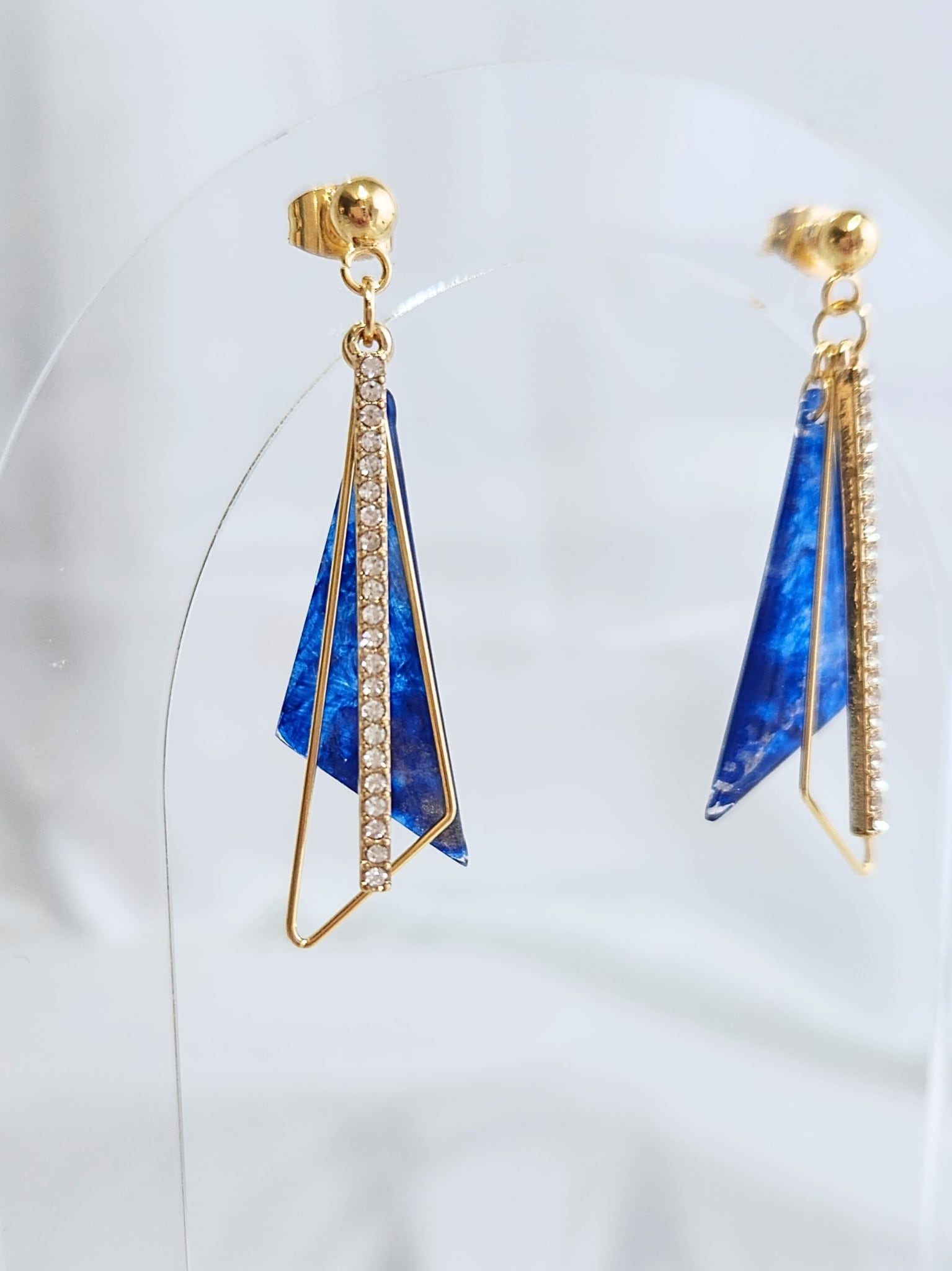 ▪️Azure Triangle 直線の美しさを大切にデザインしたピアス/イヤリング。 空を思わせる青い三角形と、光の筋のようにまっすぐ伸びるクリスタルスティックを組み合わせました。 シャープな印象の中に、優美さとやさしさを感じられるデザインです。 前向きな気持ちを灯す“希望の光”をイメージして仕上げました。 Azure(アジュール)は空や海の青を表す言葉です。 ■金具をお選びください■ 未選択の場合にはピアスでお作りいたします。 ■アレルギー対応■ ・ピアス(サージカルステンレス) ・イヤリング(ニッケルフリー) *全ての方にアレルギーが出ないということではありません。 *水や汗、薬品等に直接触れないように注意してお取り扱いください。