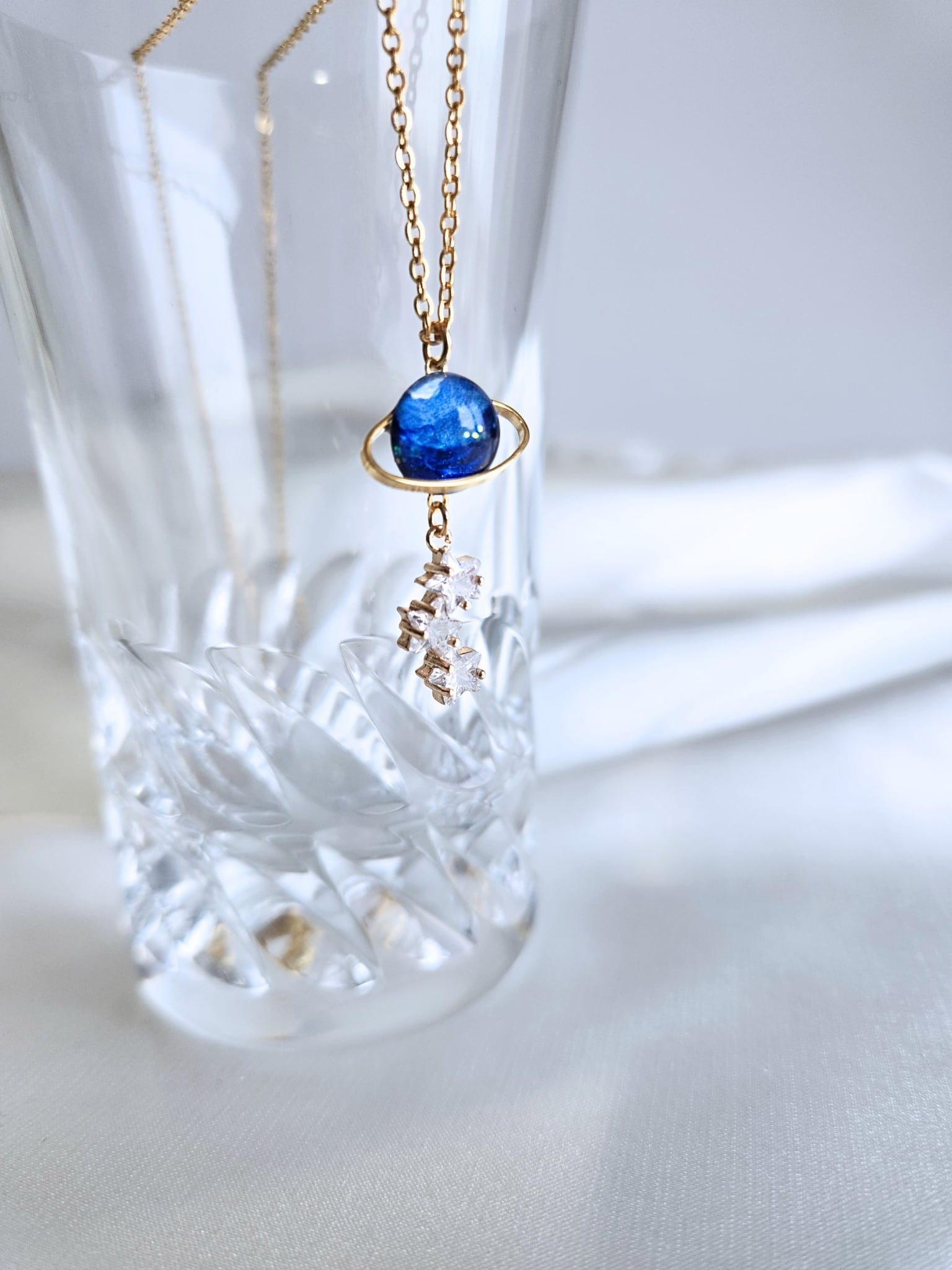 この美しいネックレスは、青い惑星をイメージしたデザインで、